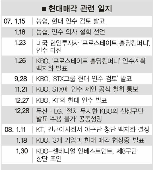 KBO는 운영난에 빠진 현대 구단의 주인을 찾기 위해 농협중앙회,STX그룹,KT 등과 잇따라 접촉했지만 모두 실패,3전4기 끝에 성공했다.