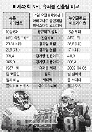 아킬레스건은 쿼터백 엘리 매닝의 경험부족과 실책. 매닝은 지금까지 20개의 가로채기를 당했다. 믿는 구석이라곤 오시 우메니오라. 시즌 13개의 ‘색(sack·쿼터백의 패스를 차단하는 태클)’을 기록, 브래디를 강하게 압박하면 의외의 결과가 나올 수 있다. 뉴욕으로선 색다른 징크스에 기대를 걸어야 한다. 정규리그에서 6점차 이하로 이긴 팀이 슈퍼볼에서 그 팀에 되레 물린 경우가 7차례 중 6번이나 되는 것. 정규리그에서 3점차로 진 자이언츠가 설욕한다면 사상 최대의 파란이 연출된다.