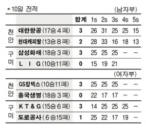여자부 GS칼텍스는 최근 주전들의 체력이 바닥난 흥국생명을 3-0으로 꺾고 10승11패를 기록,3위 굳히기에 들어갔다.2위 KT&G(15승6패)도 한국도로공사(6승15패)에 3-1 역전승을 거뒀다.