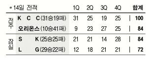 전주에서는 KCC가 서장훈(18점)과 브랜든 클럼프(23점)를 앞세워 꼴찌 오리온스를 100-84로 꺾고 5연승을 내달렸다.KCC는 삼성을 반경기차로 밀어내고 단독 2위로 올라섰다.