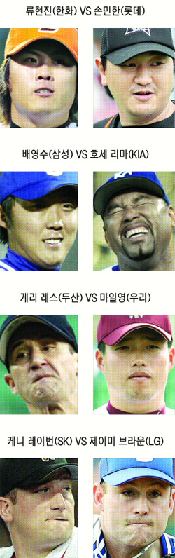 디펜딩 챔피언 SK의 홈개막전이 열리는 인천 문학구장에서는 검증된 ‘한국형 용병 투수’의 맞대결이 펼쳐진다. 지난해 우승의 일등공신 케니 레이번(34·SK)에 맞서 LG는 삼성에서 데려온 에이스 제이미 브라운(31)으로 정면승부를 꾀한다. 특히 눈길을 끄는 곳은 바로 대전구장. 류현진(21·한화)과 손민한(33·롯데), 한국프로야구를 대표하는 신·구 에이스들이 맞붙는다.2008 프로야구 개막전 최고의 빅카드다. 이들은 베이징올림픽 최종예선에서 선발진의 한 축으로 올림픽행 티켓 획득을 합작했다. 그러나 다시 만난 지금 무승부는 없다. 오직 승리의 영예와 패전의 씁쓸함만 있을 뿐이다.