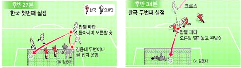 첫 실점 2분 뒤 “미스도 잦고 체력적인 부담이 온 것 같은”(허 감독) 김남일(빗셀 고베)을 A매치 경험이 4경기에 불과한 조용형과 교체한 것도 승리를 제 손으로 내준 패착이었다. 수비진은 더욱 우왕좌왕했고 동점골을 내줬다. 허 감독은 기자회견에서 “썩 좋았던 선택은 아니었다.”고 시인했다.