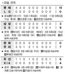 SK의 ‘괴물’ 김광현은 문학에서 삼성을 제물로 10승 고지에 선착, 다승 선두를 질주했다.‘윤길현 파동’을 딛고 일어선 SK는 삼성을 9-3으로 꺾고 3연승,7할승률(.701·47승20패)에 복귀했다. 반면 삼성은 시즌 첫 5연패. 목동에선 히어로즈가 한화의 다이너마이트 타선을 단 1안타로 잠재우며 7-0으로 이겼다.1안타는 올시즌 팀 최저안타.