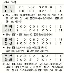 꼴찌 LG가 독주 태세를 구축한 선두 SK에 2연승을 거뒀다. 그것도 무서운 뒷심을 발휘, 올시즌 연장전에서 1승5패로 약했던 징크스를 털고 지난달 3일 3연승 이후 한 달여 만에 연승 행진도 벌였다.LG가 3일 잠실에서 열린 프로야구 SK와의 경기에서 2-3으로 패색이 짙던 9회말 2사뒤 이종열의 1점 홈런으로 승부를 원점으로 돌린 뒤 연장 10회 안치용의 끝내기 안타로 역전승했다.