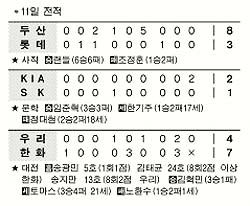 한화 마무리 브래드 토마스는 1이닝을 무실점으로 막고 21세이브(3승4패)째를 챙기며 오승환(삼성)을 1개 차로 제치고 이 부문 단독 1위로 나섰다. 히어로즈 전준호는 7,9회 연속 도루를 성공시켜 10개째를 작성, 역대 처음 18년 연속 두 자릿수 도루에 성공했지만 팀 패배로 빛이 바랬다. 두산은 사직에서 롯데를 8-3으로 누르고 5연승했고,LG는 잠실에서 삼성을 6-4로 제압하고 4연패에서 벗어났다.