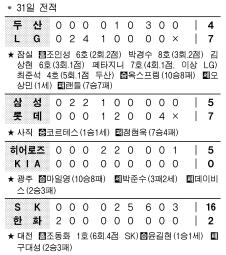 한편 SK는 조동화의 개인 통산 첫 번째 만루홈런 등 25안타를 몰아치며 한화를 16-2로 제압했다.25안타는 올시즌 한 팀 최다 안타 기록. 히어로즈는 8이닝 동안 KIA 타선을 단 2안타로 꽁꽁 묶는 마일영의 역투를 앞세워 5-0으로 승리, 최근 6연패에서 탈출했다. 꼴찌 LG는 최근 3연패의 부진을 털어내려는 듯 모처럼 홈런포 4방에 선발 전원 안타의 불꽃쇼를 선보이며 갈 길 바쁜 두산을 7-4로 꺾었다.