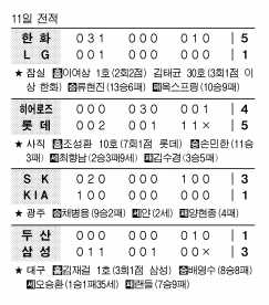 롯데는 11일 사직에서 열린 히어로즈와의 경기에서 선발 손민한이 7이닝 동안 12안타를 내주면서도 3실점으로 역투하고, 조성환의 역전 1점 홈런포에 힘입어 5-4로 승리했다. 후반기 들어 14승1패의 무서운 상승세를 탄 롯데는 지난 6월7일 이후 다시 2위를 밟았다.