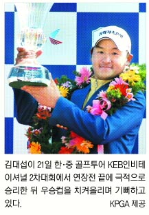 김대섭은 21일 강원도 횡성 오스타골프장 남코스(파72·6652m)에서 열린 한·중 골프투어 KEB인비테이셔널 2차대회 최종라운드에서 보기 3개, 더블보기, 트리플보기를 하나씩 기록하는 극심한 난조로 4오버파를 쳤다. 하지만 연장전 끝에 김대현(20·동아회원권)을 제치고 우승을 차지했다.2005년 11월 KPGA선수권 우승 이후 처음이다. 프로 통산 4승째.