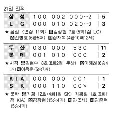 역대 최연소 타격왕을 노리는 김현수(20)는 9-2로 앞선 8회 1사 2루에서 승리를 확인하는 시즌 8호 홈런을 날리는 등 5타수 3안타 4타점으로 시즌 타율을 .359로 끌어올리며 타격 선두를 질주했다. 삼성은 잠실에서 3-3으로 맞선 연장 11회 초 1사 2루에서 박진만의 결승 3루타를 앞세워 LG를 5-3으로 누르고 5위 한화의 승차를 2.5경기로 늘렸다.