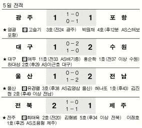 한편 포항은 광주와 1-1로 비겼고 전남은 종료 직전 두 골을 몰아쳐 울산을 2-1로 꺾었다. 전북은 제주에 2-1로 이기면서 승점 28점으로 6위 인천을 1점 차로 쫓아 6강 PO싸움을 안개속으로 몰고 갔다.