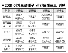 20일 서울 청담동 리베라호텔에서 열린 한국배구연맹(KOVO) 2008여자 신인선수 드래프트에서 여고 랭킹 1위 염혜선이 지난 시즌 꼴찌로서 세터 보강이 절실했던 현대건설에 1라운드 1순위로 지명됐다. 또 1라운드 2순위 지명권을 갖게 된 한국도로공사는 황민경(세화여고·라이트)을 지명했다. 황민경은 174㎝ 단신이지만 탄력이 좋아 프로에서도 공격의 한 축을 떠맡을 수 있을 전망이다.KT&G는 센터 김은영(대구여고)을 1라운드 3순위로 지명했다. 관심을 모았던 국내 여자 최장신 센터 김지애(목포여상·192㎝)는 1라운드 4순위 지명권을 가진 흥국생명 품에 안기게 됐다.KT&G가 김지애 아닌, 김은영을 뽑음으로써 뒤늦게 횡재한 셈. 단신의 약점을 극복할 수 있게 됐다.