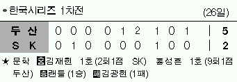 SK는 7회 1사 뒤 나주완의 안타와 정근우의 2루타로 1점을 쫓아가는 데 그쳤다. 그러나 김성근 감독은 지난해 재현을 꿈꾸며 여유를 보였다. 김성근 감독은 좌익수 박재상의 수비 실수로 1점을 더 준데 대해 “당구장에 데려가서 스리쿠션 훈련을 시켜야겠다.”며 웃었다.SK는 지난해 두산과의 한국시리즈에서 2연패한 뒤 4연승, 우승컵을 안았다.2차전은 27일 오후 6시에 같은 장소에서 열린다. 두산은 김선우,SK는 채병용을 선발로 예고했다.