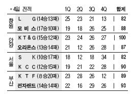 반면 SK는 4연패로 몰렸다.4쿼터에 목을 다쳐 실려간 SK 방성윤은 복귀 후 가장 적은 10점에 그쳤고 전치 4주 진단을 받았다.KT&G는 오리온스를 100-87로 사냥했다.올시즌 오리온스에 3전 전승.3연패를 끊은 KT&G는 삼성과 공동 3위가 됐다.전자랜드는 서장훈(23점)과 리카르도 포웰(27점)을 앞세워 꼴찌 KTF를 93-89로 꺾었다.5할 승률에 복귀한 전자랜드(14승14패)는 6위로 올라섰다.