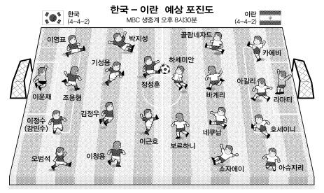 그러나 큰 경기 경험이 많고 그라운드를 종횡무진 누비는 박지성(28·맨체스터 유나이티드)이 미드필드에서부터 상대를 압박하고, 이영표를 중심으로 한 최후방 수비진이 스페인 프리메라리가에서 뛰는 이란의 공격형 미드필더 자바드 네쿠남(29·오사수나·A매치 23골)과 카림 바게리(35·테헤란·A매치 50골)를 틀어막은 뒤 골을 노릴 참이다.