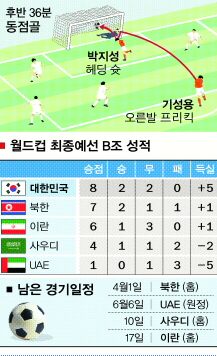 한국은 11일 테헤란에서 벌어진 이란과의 2010년 월드컵 아시아 최종예선 4차전에서 박지성(28·맨체스터 유나이티드)의 극적인 동점골로 무승부를 기록했다.