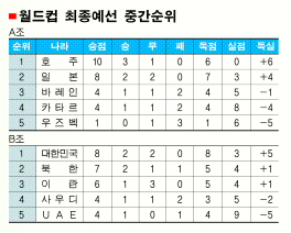 태극전사들은 4월1일 북한을 서울로 불러들여 5차전을 치른다. 앞서 3월28일엔 북한(2승1무1패·승점 7)에 밀려 3위로 내려앉은 이란(1승3무·승점 6)과 4위 사우디(1승1무2패·승점 4)의 경기, 그리고 북한과 5위 아랍에미리트연합(UAE·1무3패·승점 1)이 맞붙는다. 한국은 북한과 지난해에만 네 차례 대결해 모두 승부를 가리지 못했다. 남북대결을 치른 뒤에는 6·7차전이 기다린다. 6월6일 맞붙을 UAE와는 8승5무2패로 우위에 있다. 그러나 벼랑에 선 UAE가 텃세를 앞세운 안방에서 젖먹던 힘까지 다할 태세여서 섣불리 승부를 점칠 수 없다. 이후 나흘 뒤인 10일 사우디와 서울에서 7차전을 벌인다. 안방에서 치를 6월17일 이란과의 최종예선 마지막 경기를 본선 진출을 자축하는 잔치판이 될 수 있도록 하기 위해서는 북한, UAE를 상대로 최대한 승점을 쌓아야 한다는 숙제가 걸렸다. 앞으로 4경기 중 3승을 챙겨야 자력 본선행이 가능하다.