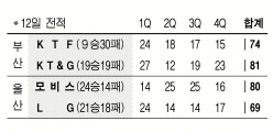 부산에선 KT&G가 KTF를 81-74로 꺾고 2연패를 끊었다. 시즌 상대전적 4승1패. 19승19패로 5할 승률에 복귀한 KT&G는 7위 SK를 1경기 차로 밀어냈다. 반면 꼴찌 KTF는 6연패.