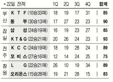 KT&G는 주희정(22점 8어시스트)을 앞세워 삼성을 93-85로 눌렀다. 주희정은 2개의 가로채기를 보태 첫 개인통산 1100스틸을, 3개의 리바운드를 낚아 3번째 통산 2400리바운드도 돌파했다.