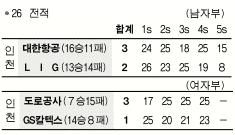 앞서 열린 여자부 경기에서는 꼴찌 도로공사가 ‘도미니카 특급’ 밀라(34점)의 원맨쇼에 힘입어 선두 GS칼텍스를 올 시즌 처음으로 3-1로 꺾는 이변을 연출했다. 도로공사(7승15패)는 GS칼텍스전 5연패에서 탈출하는 기쁨을 맛봤다.