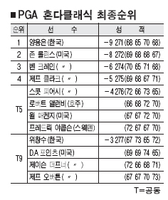 양용은은 9일 플로리다주 팜비치가든스의 PGA내셔널 골프장 챔피언스코스(파70·7158야드)에서 벌어진 혼다클래식 4라운드에서 버디 5개와 보기 3개를 번갈아 쳐 2타를 줄인 최종합계 9언더파 271타로 존 롤린스(미국·9언더파 272타)의 추격을 1타차로 따돌리고 우승했다. 2006년 유러피언프로골프(EPGA) 투어 HSBC챔피언스에서 타이거 우즈(미국)를 따돌리고 우승한 이후 28개월 만에 거둔 금쪽 같은 우승. 2005년 데뷔한 PGA 투어에서는 4년 만의 생애 첫승이다.