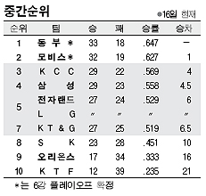 3~4위 KCC와 삼성은 안정권으로 분류된다. 결국 0.5경기차인 공동 5위 전자랜드와 LG, 7위 KT&G의 경합 양상.