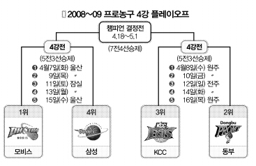 운명처럼 만났다. 프로농구 4강 플레이오프(PO·5전3선승제) 얘기다. 6강 PO는 예상보다 험난했지만 결국 삼성, KCC가 살아 남았다. ‘단신팀(모비스 vs 삼성)’, ‘장신팀(동부 vs KCC)’끼리의 매치업은 이번에도 마찬가지다.