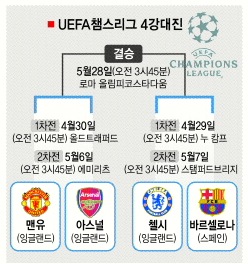 맨유가 만나는 장벽은 아스널. 지난해 11월 시즌 첫판에서 1-2로 무릎을 꿇었다. 특히 아스널에선 ‘토고 표범’ 에마뉘엘 아데바요르(25)가 챔스리그 5득점으로 공동5위를 달리며 영양가 만점의 활약을 펼쳤고, 스페인 용병 세스크 파브레가스(22)는 5도움으로 2위에 올랐다. 4골을 넣은 로빈 페르시(26)도 숨은 보배다. 맨유는 웨인 루니(24)와 불가리아 특급 디미타르 베르바토프(28·이상 4골)에게 기대한다.