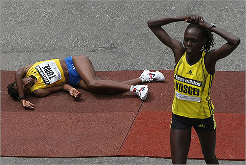세상에 이처럼 기막힌 일이 또 있을까.지난해 보스턴 마라톤 우승자인 디레이 투네이(23,에티오피아,아래 사진 왼쪽)는 20일(현지시간) 열린 제113회 대회 여자부에서 살리나 코스게이(케냐,32,아래 사진 오른쪽)와 함께 줄곧 앞서가던 카라 가우처(미국,30)를 앞질렀다.결승선을 1.6㎞ 남겨둔 시점이었다.이제부터 뒤에서 호시탐탐 기회를 엿보는 가우처가 따라붙는 가운데 둘의 숨막히는 접전이 시작됐다.