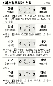 B조 제주는 서귀포 홈 경기에서 최현연과 오봉진, 오베라(2골)의 릴레이 득점에 힘입어 광주를 4-1로 누르고 통산 300승을 달성했다. 울산과 포항, 부산, FC서울에 이어 다섯 번째. 제주는 2003년 10월26일 이후 광주전 홈 10경기 연속 무패(6승 4무)에서도 벗어났다.