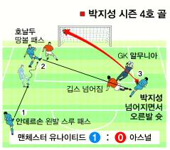 퍼거슨 감독은 4-5-1 포메이션으로 철벽을 쌓았다. 오른쪽의 크리스티아누 호날두와 짝을 맞춰 왼쪽 날개를 맡은 박지성은 90분 동안 두 팀을 통틀어 가장 많은 10.8㎞를 뛰며 퍼거슨을 흡족하게 만들었다. 박지성은 전반 8분 큰 일을 냈다. 호날두가 페널티 지역 왼쪽을 치고 들어가 가운데로 찔러준 공을 골 지역 오른쪽에서 오른발 슛으로 네트를 흔들었다. 아스널 수비수 키어런 깁스가 미끄러지면서 손까지 써가며 막으려 하자, 그의 몸을 뛰어넘어 역시 미끄러지며 골키퍼 마누엘 알무니아를 살짝 제치는 재치 만점의 슈팅을 때렸다. 5만 6860여명의 아스널 홈팬들은 숨을 죽였으며, 3000명 남짓한 맨유 팬들은 박지성 응원가를 소리높여 불렀다.