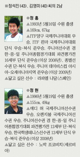 테니스 코트에 ‘무서운 형제‘가 떴다. 혜성처럼 등장해 주니어 무대를 평정하고 있는 정홍(16·삼일공고), 정현(13·수원북중)군. 테니스선수 출신인 정석진(43·삼일공고) 감독의 사랑스러운 두 아들이다. 역시 피는 못 속이나 보다. 세계적인 선수들을 보유한 IMG가 5년 동안 전액 장학금과 숙소를 제공하며 이들을 ‘키우기로’ 했다. 6월 말 미국 플로리다주 ‘닉 볼리테리 테니스아카데미’에서 체계적인 훈련을 시작한다. ‘세계 톱10에 들겠다.’는 똘똘한 소년들이 조만간 미프로테니스(ATP) 투어도 접수할 것 같은 기대감이 솟는다.‘아빠’ 정석진 감독은 “남들은 로또 맞았다고 하더라고.”라면서 호탕하게 웃었다. 타지에 어린 아들 둘만 보내는 심정이 어찌 마냥 좋겠냐만 ‘야무진 아들들’이 자랑스럽다.