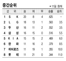2009프로야구가 11일 현재 팀 당 29~32경기를 치르며 페넌트레이스의 23.3%를 소화했다.