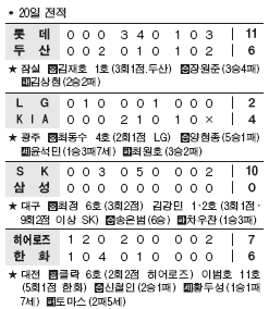 롯데는 잠실에서 두산을 11-6으로 꺾고 3연패에서 탈출했다. 8번타순에서 4타점을 쓸어담은 덕수정보고 출신 3년차 내야수 김민성의 활약이 단연 돋보였다. 지명타자로 나선 롯데 홍성흔은 역대 33번째 600타점을 돌파했다.