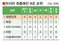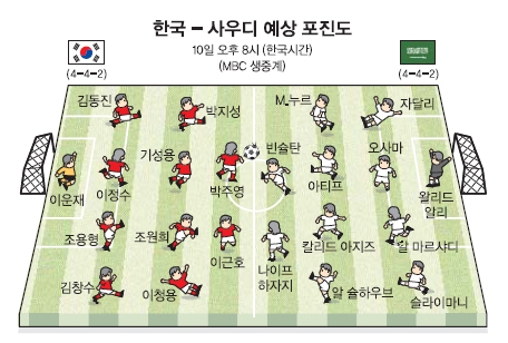 7회 연속 월드컵 무대를 확정지은 한국이지만 ‘중동의 강호’ 사우디는 만만한 상대가 아니다. 상대 전적에서도 4승6무5패로 박빙이다. 지난해 11월 월드컵 최종예선 3차전에서 2-0 승리를 거두기 전까진 19년간 ‘무승 징크스’에 시달리기도 했다. 사우디는 3승1무2패(승점10)로 한 경기를 더 치른 북한(승점11)에 이어 조 3위. 한국을 이긴다면 18일 안방에서 치르는 마지막 북한전에서 비기기만 해도 조 2위로 월드컵에 5회 연속 진출한다. 사우디가 한국전에 사활을 걸 수밖에 없는 이유다.