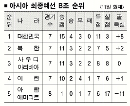 남은 경기는 오는 17일 두 판. 한국은 이란을 홈으로 불러들여 예선 무패 기록을 걸고 다툰다. 북한은 사우디와 리야드 원정 경기를 치른다.
