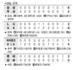 광주에서는 KIA가 선발 이대진의 무실점 호투에 힘입어 히어로즈를 5-1로 제압했다. 이대진은 지난해 7월19일 두산전 이후 345일 만에 승리의 기쁨을 맛봤다. ‘종범神’ 이종범은 1회 2루타를 때려내며 역대 4번째로 2루타 300개 기록을 작성했다.