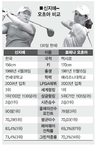 반면 오초아는 평균 타수 부문에서는 1위(70.03타)에 올랐지만 페어웨이 안착률은 69.3%(87위), 그린 적중률도 70.3%(14위)에 그치는 등 올 시즌 감각이 무뎌졌다. 하지만 맥도널드 LPGA 챔피언십 이후 잠시 쉬었던 오초아는 캐디 데이비드 브루커를 그렉 존스턴으로 교체해 반전을 노린다. 오초아는 7월 제이미 파 오웬스 대회를 시작으로 US여자오픈, 에비앙 마스터스, 브리티시여자오픈 등 특급 대회에서 신지애와 잇따라 격돌할 전망이다.