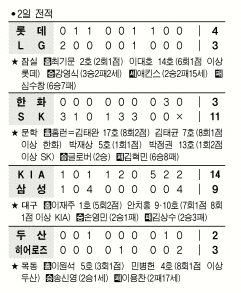 사흘째 명승부가 이어진 잠실에선 4위 롯데가 7위 LG를 4-3으로 꺾었다. LG는 올시즌 팀 첫번째 선발전원안타를 때리고도 무릎을 꿇었다.