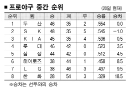 중위권에서 전개된 ‘샅바 싸움’이 선두권까지 번지고 있다. 1~5위 승차는 불과 4.5 경기. 무승부를 패로 계산하는 올 승률 계산법에 따르면 1~5위 승률 차이는 4푼2리까지 좁혀졌다. 이런 상황에서 자칫 연패라도 당하는 날이면 곧바로 나락으로 떨어진다. 어느 팀도 포스트시즌 진출을 장담할 수 없는 대혼전이 펼쳐지고 있는 것.