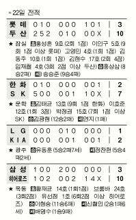 두산이 10-3, 완승을 거두며 선두를 고수했다. 롯데의 연승행진은 ‘8’에서 끝났다. 또 5월3일 두산전 이후 계속된 송승준의 연승도 ‘9’에서 멈췄다.