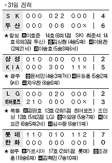 두산이 최준석의 통렬한 역전 결승 3점포에 힘입어 SK를 꺾고 단독 선두로 올라섰다.두산은 31일 프로야구 잠실 SK전에서 최준석의 3점포를 앞세워 6-4로 승리했다. 두산은 이날 승리로 KIA와 나란히 시즌 50승 고지를 밟았다. 반면 SK는 6월21일부터 이어진 두산 전 연패 숫자를 ‘4’로 늘리며 1위에서 3위로 곤두박질쳤다.