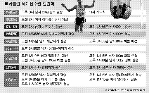 지구촌 3대 스포츠 잔치인 세계육상선수권대회가 15일 독일 베를린에서 개막한다. 사상 최대인 202개국, 2101명의 건각이 24일까지 각축을 벌일 대회에는 47개의 금메달이 걸렸다. 2011년 대구 대회를 개최하는 한국으로서는 운영 노하우를 익혀야 할 뿐 아니라, 세계 수준과 경기력 격차를 줄이는 숙제도 안았다. 한국은 8개 종목에 20명(남 15명, 여 5명)을 파견했다. 월드스타들의 인간 한계 도전과 한국 선수들의 전망을 두 차례에 걸쳐 짚어본다.