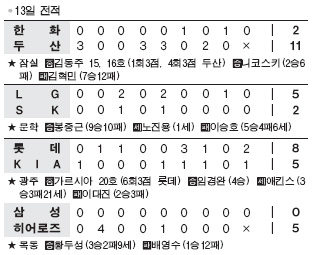 잠실에서는 두산이 ‘두목곰’ 김동주의 연타석 홈런을 포함, 장단 16안타로 ‘꼴찌’ 한화를 두들겨 11-2 완승을 거뒀다. 김동주는 1회 선제 3점포를 터뜨렸고, 이 홈런 한 방으로 시즌 10번째 통산 900타점을 돌파하는 영예를 안았다. 한화는 8연패에 빠졌다.