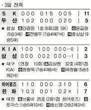 잠실에서는 SK가 두산을 11-5로 대파하고 7연승을 질주했다. SK 노장 안경현은 6회 15개월 만에 2점포를 쏘아 올리며 승리의 수훈갑이 됐다. 대전에서 한화는 히어로즈에 7-6, 짜릿한 1점차 승리를 거뒀다.