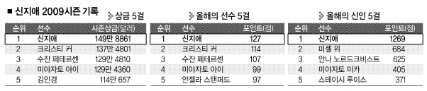 지난 3월 HSBC위민스챔피언스와 6월 웨그먼스LPGA에 이어 석달에 한 차례씩 우승하며 올 시즌 가장 먼저 3승을 수확한 신지애는 우승상금 27만달러를 챙겨 종전 1위 크리스티 커(미국)를 따돌리고 상금랭킹 선두로 올라섰다. 동시에 올해의 선수 부문과 다승에서도 모두 선두. 사실상 수상을 확정지은 ‘올해의 신인’ 부문까지 포함, 데뷔 시즌에 4관왕을 ‘싹쓸이’할 수 있을 전망이다. LPGA 투어 31년 만. ‘골프 여왕’ 박세리(32)도 일구지 못한 꿈이다.