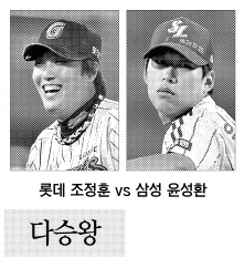 다승왕은 현재 롯데 조정훈과 삼성 윤성환의 양강구도. 공교롭게도 4위를 다투는 두 팀 에이스의 대결 양상이다. 삼성 선동열 감독은 ‘윤성환 밀어주기’를 공개 선언했다. 22일 SK전 선발은 물론, 상황에 따라 25일 한화전에 한 번 더 투입할 수도 있다는 것. 덕분에 윤성환이 유리한 상황이다.