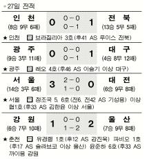인천에서는 전북이 후반 41분 브라질리아의 천금 같은 선제 결승골로 인천을 1-0으로 제압, 서울을 승점 1점 차로 추격하며 선두 탈환의 꿈을 이어갔다. 인천(8승9무6패)은 5경기 연속(3무2패) 무승에 빠졌다. 최하위 대구FC는 광주 원정경기에서 후반 인저리 타임에 터진 레오의 결승골로 광주를 1-0으로 제치고 최근 3연승을 질주, 시즌 4승째(8무12패)를 챙겼다. 광주는 9승3무11패(승점 30)가 됐다.