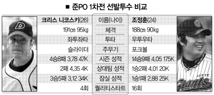두산-롯데의 준PO 1차전 선발투수의 어깨에 놓인 짐은 그만큼 무겁다. 크리스 니코스키(두산)와 조정훈(롯데)이 두 팀의 운명을 짊어졌다. 둘은 공통점이 제법 많다. 모두 국내 포스트시즌에 첫 등판.