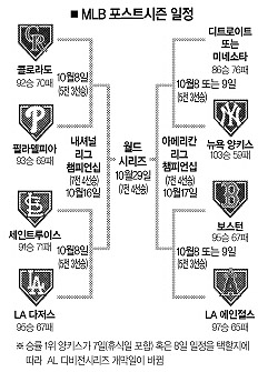 하지만 올해는 다르다. 지난해 13년 만에 포스트시즌에 오르지 못하는 수모를 겪은 뒤 스토브리그에서 4억 4100만달러를 쏟아부어 선발 CC 사바시아와 AJ 버넷, 강타자 마크 테세이라 등을 영입한 덕에 정규리그에서 103승59패로 아메리칸리그(AL) 동부지구 우승을 차지한 것. 양키스의 디비전시리즈 상대는 7일 결정된다. AL 중부지구에서 디트로이트와 미네소타가 86승76패로 동률을 이뤄 7일 단판승부로 가을야구 티켓을 결정짓는다.