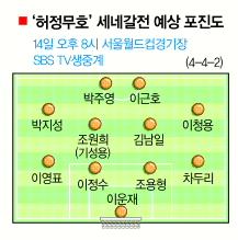 73차례 A매치에서 22골을 뽑고도 허정무호에 합류한 뒤로는 침묵한 이동국(30·전북)은 조커로 뛸 듯하다. 좌우 날개로는 박지성과 이청용(21·볼턴)이 나선다. 맨유에서 4경기 연속 결장했지만 허 감독의 무한신뢰 속에 천변만화 같은 전술 전개의 핵심으로 활약한다. 분데스리가에서 뛰는 수비수 ‘전향자’ 차두리(29·프라이부르크)의 활약 여부도 관전 포인트다.